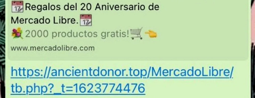 Parte del mensaje indica que la marca promociona “unos 2000 productos gratis” por el aniversario de la empresa de Marcos Galperin; la misma posee un link que se reenvía automáticamente al resto de los contactos.