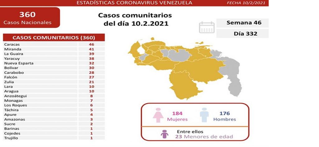 En el reporte de las últimas 24 horas la Vicepresidenta Delcy Rodríguez informó la noche este miércoles que el país registró 360 nuevos casos de transmisión comunitaria y 20 importados.