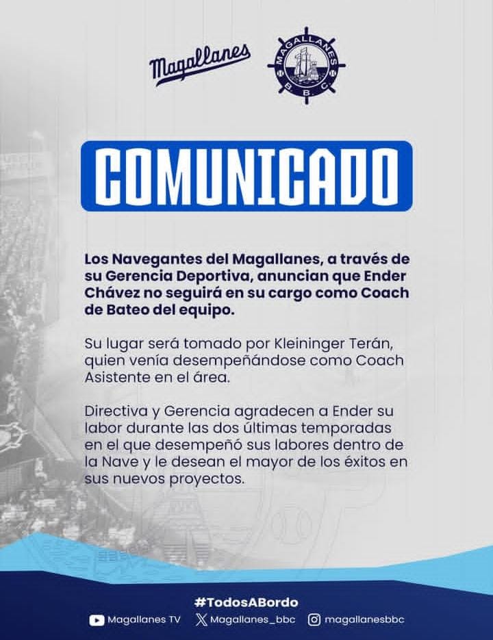 El equipo de los Navegantes del Magallanes, a través de su Gerencia Deportiva, anunció que el deportista Ender Chávez no continuará en su cargo como Coach de Bateo del equipo.