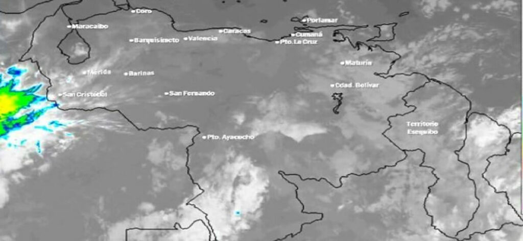 En horas de la tarde y noche, se mantendrán las nubes de evolución rápida con lluvias o lloviznas dispersas, en áreas del Zulia, Táchira, Mérida, Falcón, Miranda, Delta Amacuro, Amazonas, Bolívar y el Esequibo, el resto de territorio nacional se mantendrá con escasa nubosidad.
