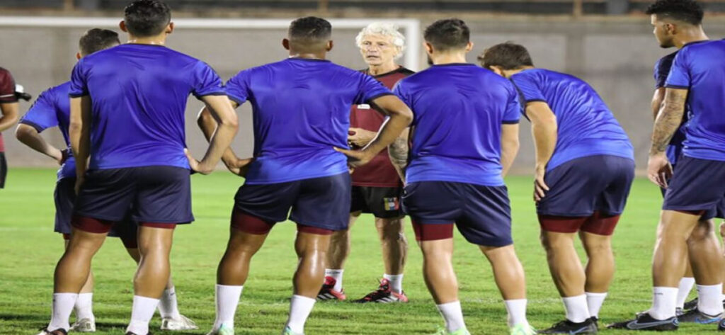 El entrenador argentino salió en una de las fotos sonriendo con la camisa vinotinto con un short negro y un silbato en la mano. En la otra imagen, Pékerman se encuentra reunido con los jugadores dentro del campo de juego.