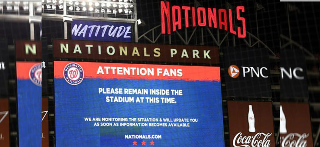 Nacionales de Washington, anunciaron en la pantalla electrónica minutos, después lo ocurrido, pidiendo a sus adicionados permanecer dentro del estadio por su integridad.