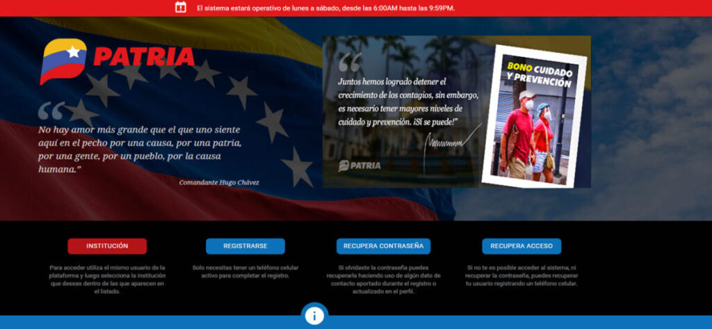 "Inicia la entrega del Bono Cuidado y Prevención enviado por nuestro presidente Nicolás Maduro, a través del Sistema @CarnetDLaPatria", dijo Patria en Twitter.