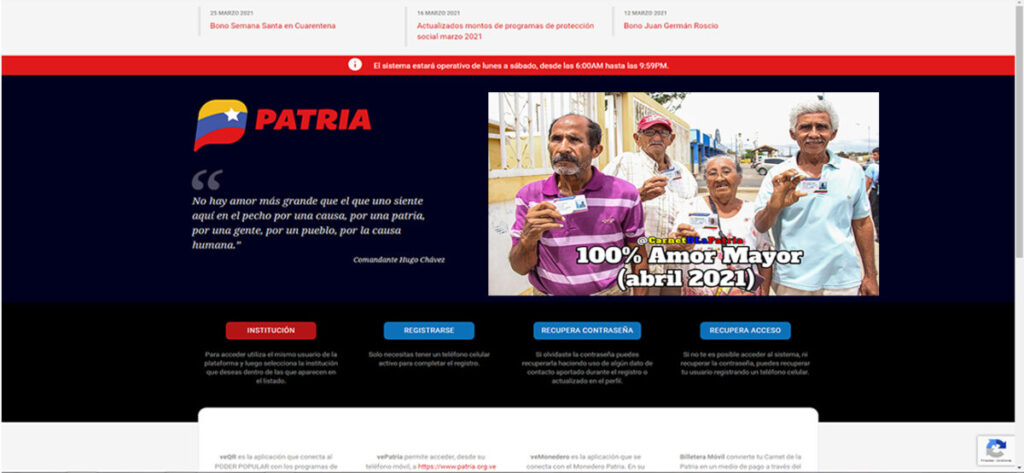 "Nuestro Presidente Nicolás Maduro aprobó la entrega de 24.916 nuevas pensiones en Amor Mayor (abril 2021) a través del Sistema @CarnetDLaPatria para mantener el 100% de atención a nuestros adultos y adultas mayores", reseñó Patria en Twitter.