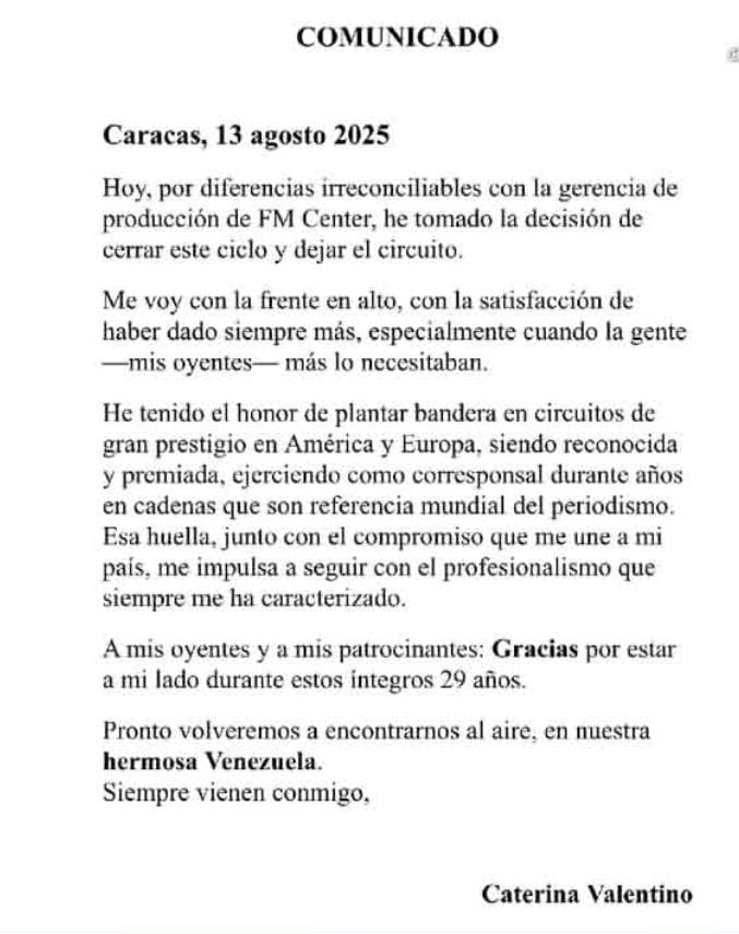 Caterina Valentino, la reconocida periodista sorprendió a todos los venezolanos al renunciar a FM Center, este circuito radial fue su casa por 29 años.