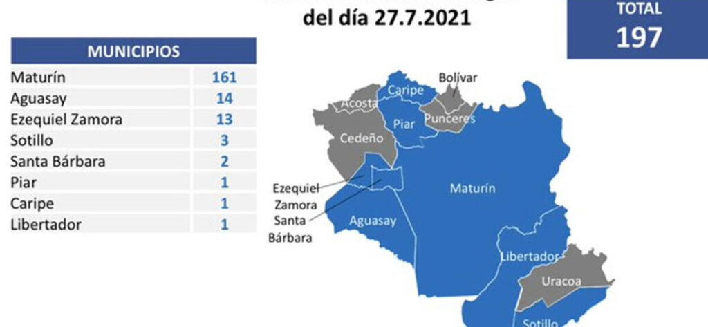 Los focos de contagios están en Maturín donde hubo 161 casos, seguido de Aguasay con 14 y Ezequiel Zamora con 13.