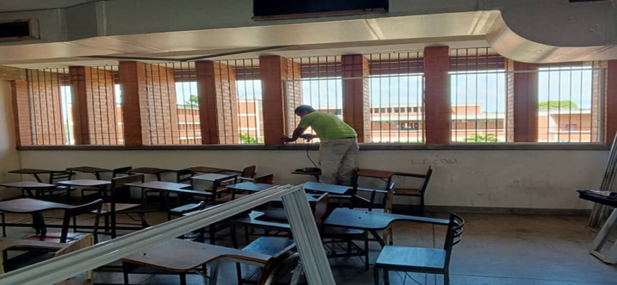 El ente adscrito a la Gobernación del estado y ejecutor de la obra: Instituto de Ecosocialismo, Hábitat y Vivienda (Inframonagas), realiza labores preliminares de desmontaje de unidades de aire acondicionado en mal estado para posteriormente acondicionar las aulas de clase.