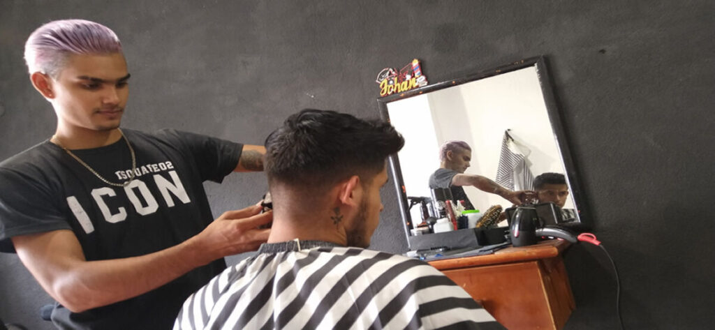 “Inicié porque mi papá tenía una máquina de cortar de cabello y una vez me dijo que se lo cortara, luego lo hice con mi hermano y poco a poco con mi círculo familiar más cercano, así fue que aprendí”, relata el joven.
