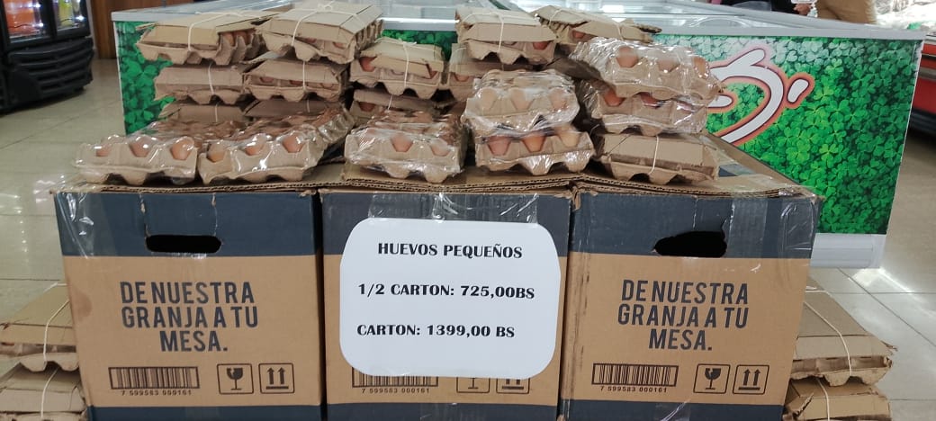 Mientras que el medio cartón de huevos se ubica en, 725 Bs.