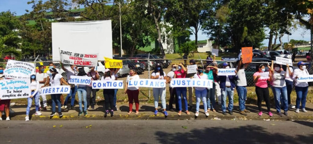"¡Libertad!, estamos contigo Luciano", decían las pancartas con las que un grupo de familiares, amigos y compañeros de trabajo de Luciano Emilio León Febres, pedían justicia y que se llegue al fondo del caso.