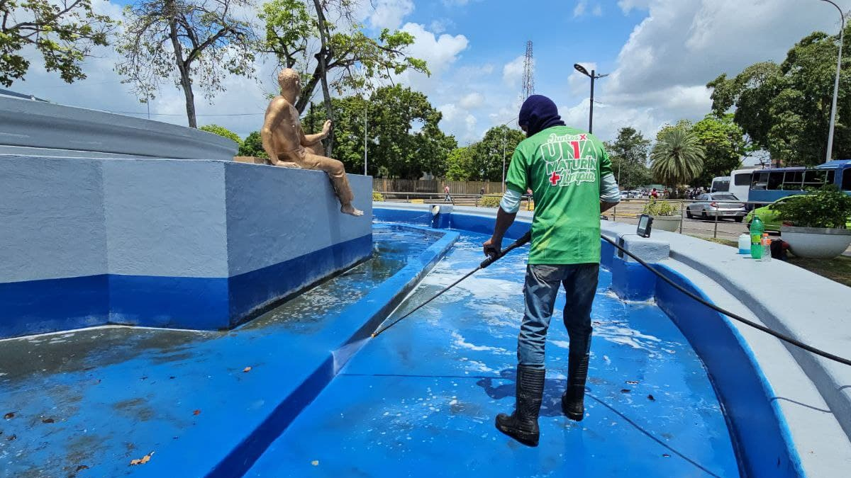 Este miércoles, una cuadrilla de trabajadores del Instituto Autónomo Municipal del Ambiente Maturín (IAMAM) ejecutó un plan de desinfección y mantenimiento en la fuente de la plaza Juana Ramírez La Avanzadora.