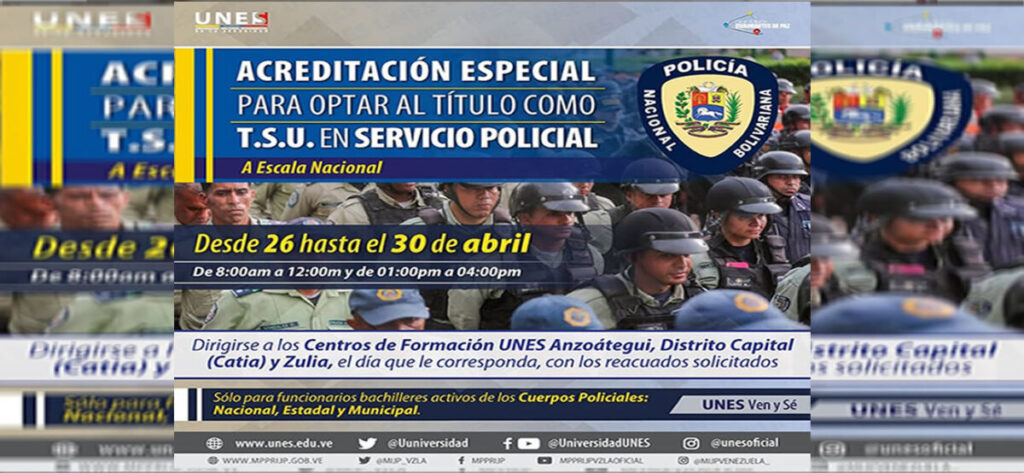 Dándole cumplimiento al objetivo de formar profesionales en materia de seguridad ciudadana, la Universidad Nacional Experimental de la Seguridad (UNES) a escala nacional ofrece la "Acreditación Especial para Optar al título como Técnico Superior Universitario (TSU) en Servicio Policial" cumpliendo con esto el Plan de Despliegue Territorial para la Profesionalización de Funcionarios y Funcionarias Activos de las Instituciones Policiales Nacional, Estadales y Municipales.