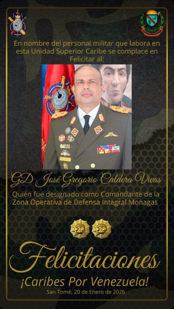 El General de División José Gregorio Caldera Vivas ha sido designado como el nuevo comandante de la Zona Operativa de Defensa Integral N° 52 (Zodi Monagas). La designación fue anunciada mediante una resolución el 20 de enero de 2026 por la presidenta encargada de Venezuela, Delcy Rodríguez, en el marco de una serie de cambios en las distintas Zonas Operativas del país.