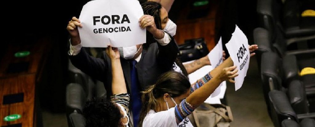 "Fascista" y "genocida" fueron algunos de los gritos que se escucharon cuando Bolsonaro comenzó a hablar ante el pleno parlamentario, en una sesión que culminó con el abandono de los legisladores de izquierda, quienes también mostraron letreros con el mismo mensaje que se replica en cada marcha opositora: "Fuera Bolsonaro", "¡Juicio político, ya!", reseñó .
