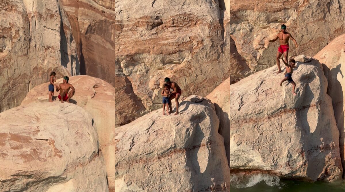 En las imágenes del video, que ya acumula más de 3.5 millones de visualizaciones y que generó reacciones encontradas, se observa cómo Garrett se encuentra junto a su hijo en lo alto de una gran formación rocosa.