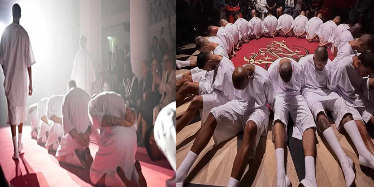 Los modelos vestidos totalmente de blanco y arrodillados en el escenario simbolizaron a los 252 migrantes venezolanos expulsados por Estados Unidos a El Salvador, donde están en la megacárcel edificada como parte de excepción del Gobierno de Nayib Bukele.