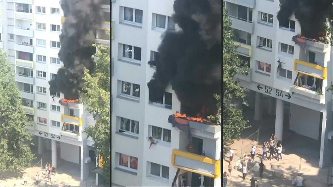 Un video en las redes sociales, los pequeños de 10 y 3 años se vieron obligados a saltar desde un noveno piso de un edificio en llamas, una altura de 9 metros, para escapar del fuego.