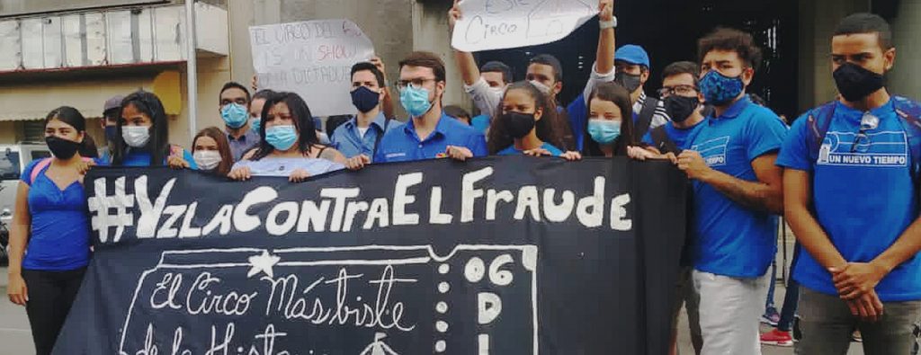Con pancartas en manos y “gritando con brío, ¡Abajo cadenas!”, los jóvenes integrantes del partido opositor Un Nuevo Tiempo (UNT) protestaron frente a la sede del Consejo Nacional Electoral (CNE), en Caracas, en rechazo a las elecciones parlamentarias a efectuarse este domingo.