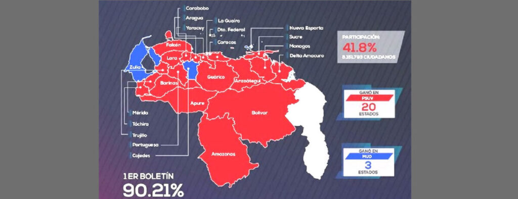 De las 23 gobernaciones en disputa, el partido de Gobierno se impuso en 20, mientras que los de oposición ganaron en tres estados, dijo el presidente del Consejo Nacional Electoral (CNE), Pedro Calzadilla, según reseña este lunes 22 de noviembre el portal BBC Mundo.