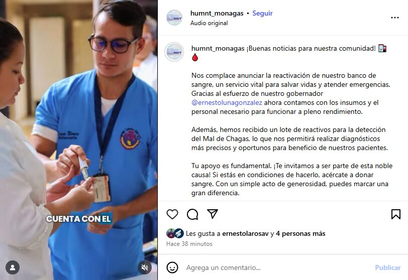 A traves de la cuenta en Isntagram del Hospital Universitario Dr. Manuel Núñez Tovar (@humnt_monagas), se dio conocer la reactivación del Banco de Sangre del recinto sanitario.