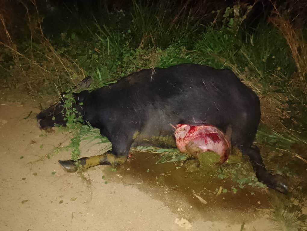 El escrito indica que el vehículo Toyota Land Cruiser de color blanco, sin placa; volcó y posteriormente impactó con animal (búfalo).