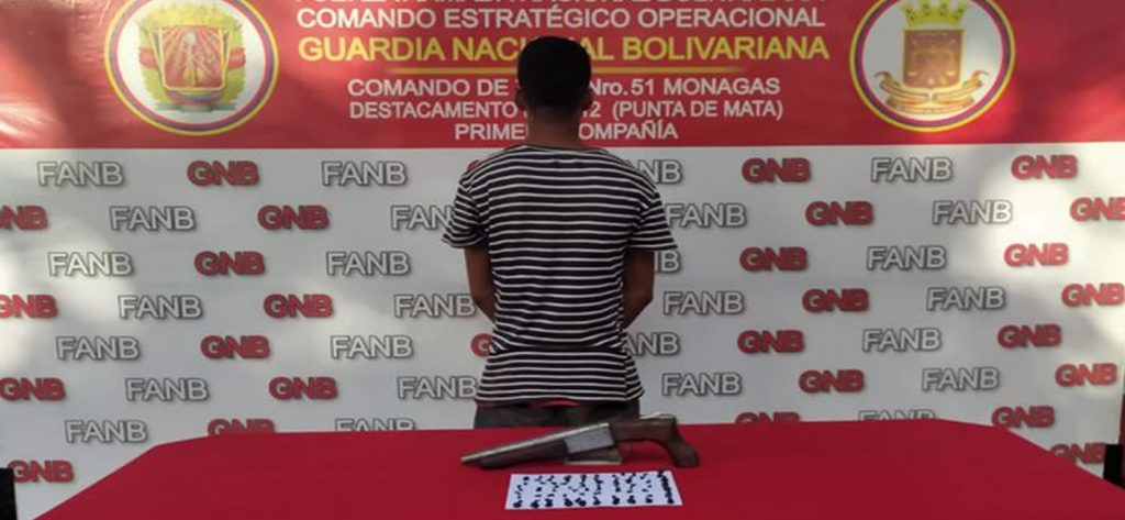 Durante labores de patrullaje de inteligencia en Punta de Mata capital del municipio Ezequiel Zamora, al oeste del estado Monagas, efectivos de la Guardia Nacional Bolivariana (GNB) detuvieron a un joven por la posesión ilícita de arma de fuego y drogas.