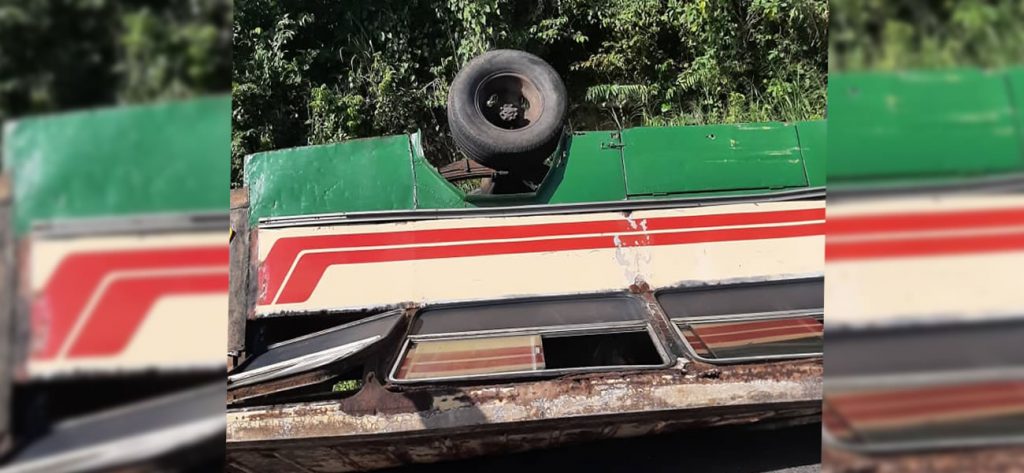 La unidad de pasajeros al parecer presentó un desperfecto mecánico, el chofer no logró maniobrarlo y el bus terminó volcándose.