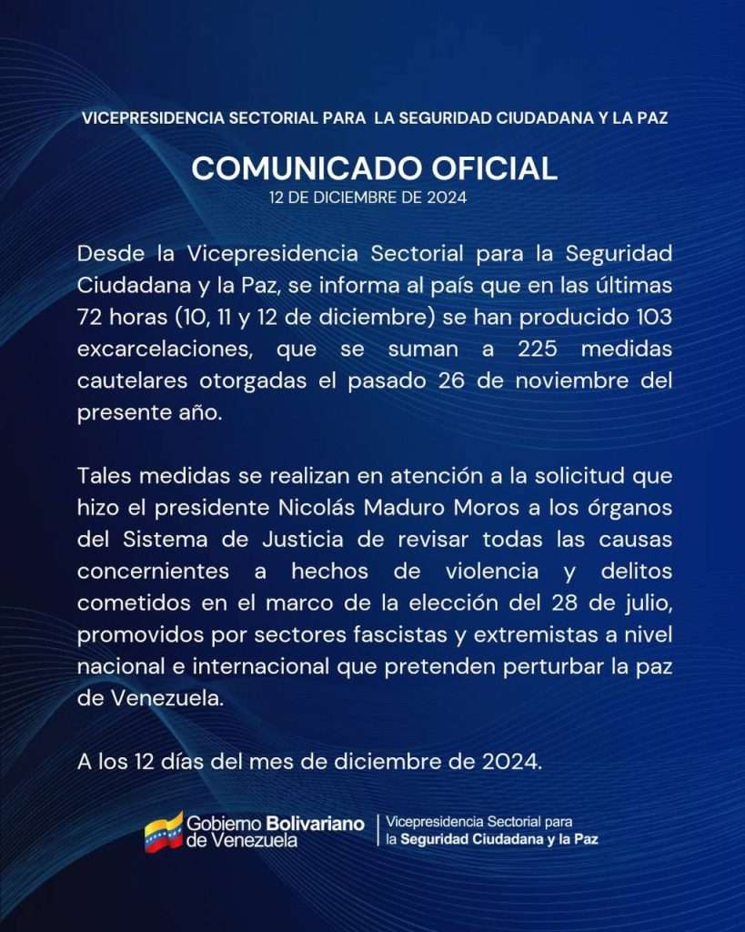 La Vicepresidencia Sectorial para la Seguridad Ciudadana y la Paz, informó a través de un comunicado, que en las últimas 72 horas, se han producido 103 excarcelaciones, que se suman a las 225 medidas cautelares otorgadas el pasado 26 de noviembre del presente año a los ciudadanos que participaron en los hechos violentos ocurridos tras los comicios electorales del pasado 28 de julio.