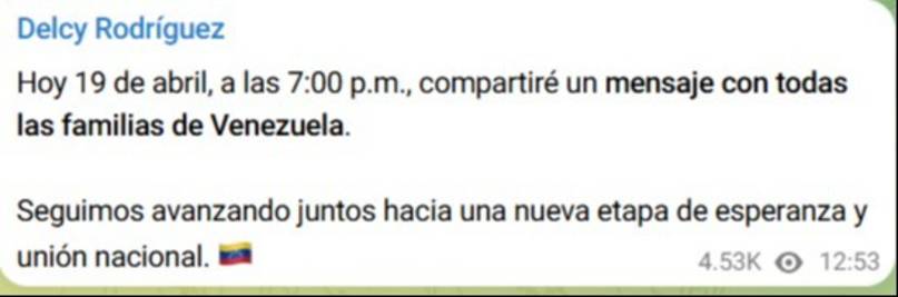 La vicepresidenta ejecutiva y presidenta (E), Delcy Rodríguez, anunció que dirigirá un mensaje especial a toda la nación este domingo 19 de abril.