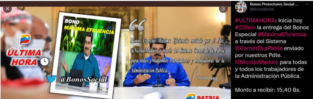 #ÚLTIMAHORAInicia hoy #23Nov la entrega del Bonos Especial #MáximaEficiencia a través del Sistema @CarnetDLaPatria enviado por nuestros Pdte. @NicolasMaduro para todas y todos los trabajadores de la Administración Pública“, dice el tuit de Bonos Protectores.