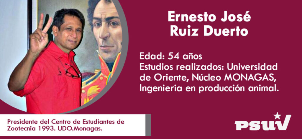 Graduado como Ingeniero en producción Animal en el núcleo de la Universidad de Oriente en Monagas, Ernesto José Ruiz Duerto, de 54 años de edad, participa en la primeras del PSUV a solicitud de las bases y como parte del resultado de una primera avanzada dentro de las filas del partido de Gobierno.