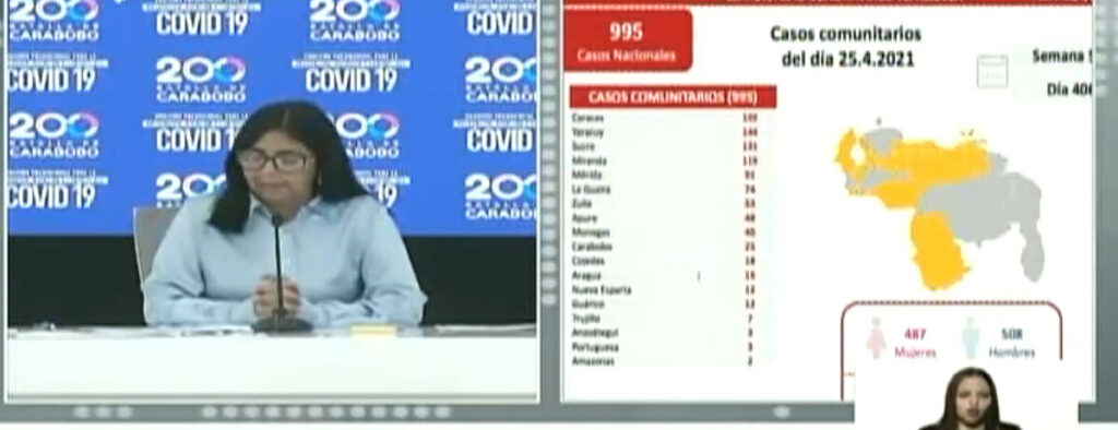 Este domingo 25 de abril, la Vicepresidenta Ejecutiva de Venezuela, Delcy Rodríguez, informó que en las 24 horas previas fueron registrados 995 nuevos contagios del coronavirus, todos de carácter comunitario.