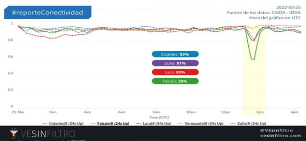 Desde la mañana de este viernes 25 de marzo, el observatorio de Internet, VE sin Filtro reportó un problema con la conexión a Internet en los estados Falcón (58 %), Lara (80 %), Zulia (81 %) y Cojedes (83 %). La caída se mide con respecto a sus niveles normales.