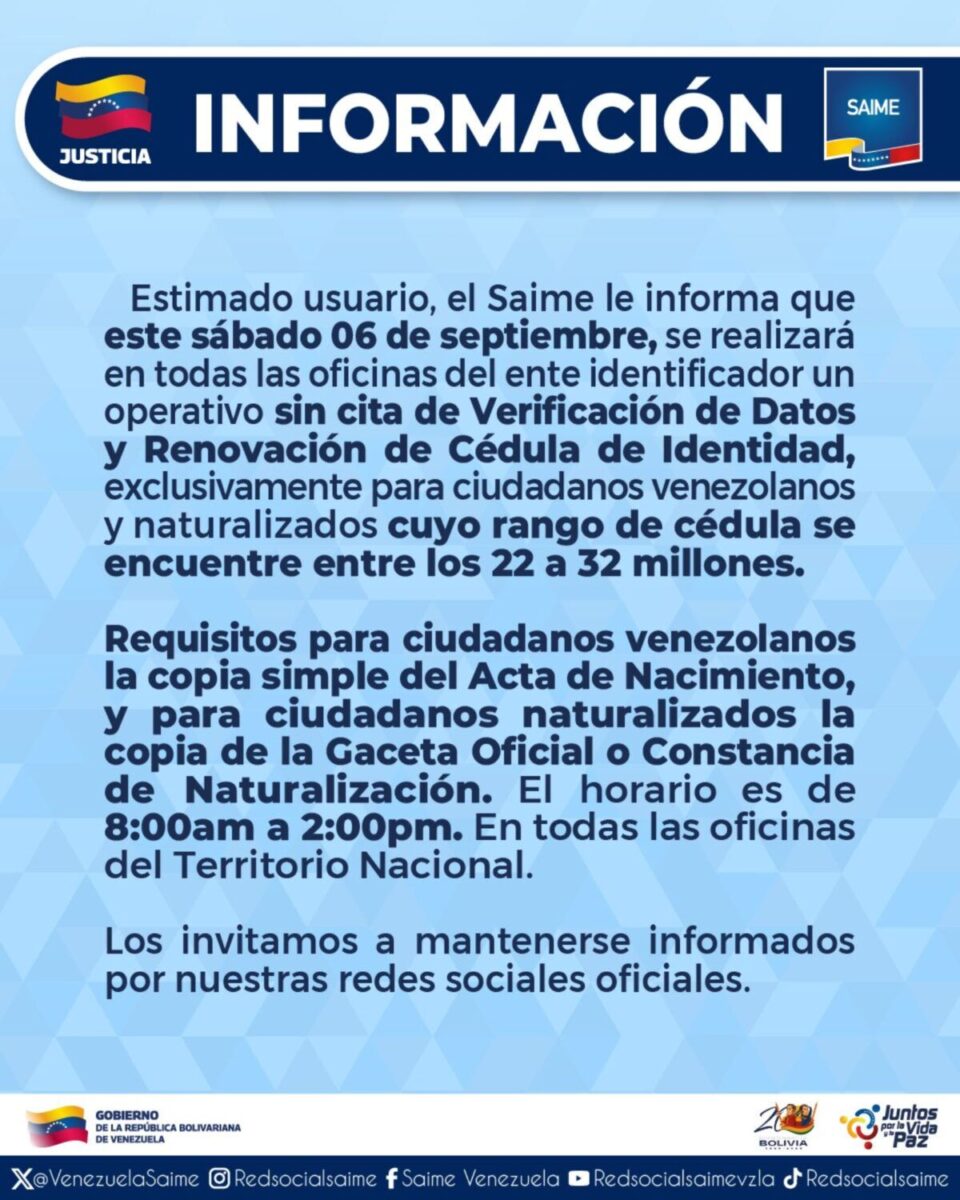 El Servicio Administrativo de Identificación, Migración y Extranjería (Saime) informó que el sábado 6 de septiembre se llevará a cabo un operativo especial de verificación de datos y renovación de cédula de identidad en todas sus oficinas del país, sin necesidad de cita previa.